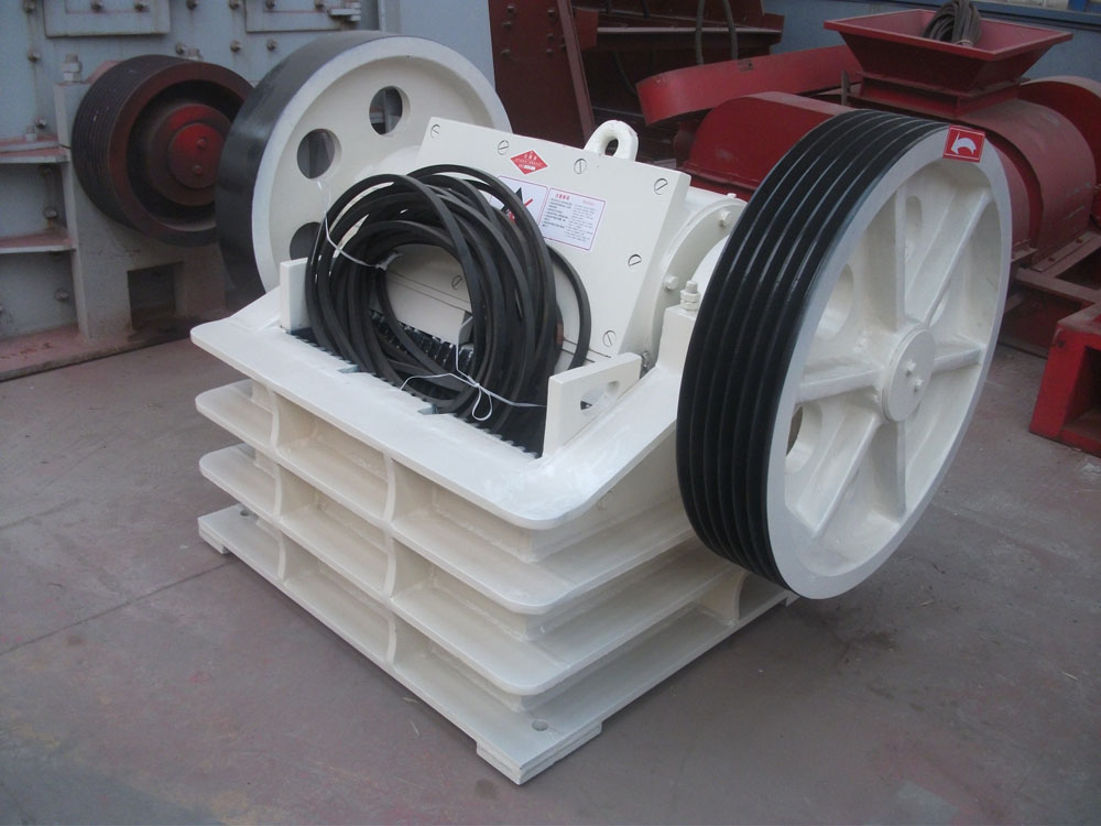 顎式破碎機的結(jié)構(gòu)主要有機架、偏心軸、大皮帶輪、飛輪、動顎、側(cè)護板、肘板、肘板后座、調(diào)隙螺桿、復位彈簧(或液壓復位裝置)、固定顎板與活動顎板等組成,其中肘板還起到保險作用,當遇到如鐵塊等不可破碎的超硬物時,顎式破碎機會啟動過載保護裝置主軸和大皮帶輪主動脫開分離,使不可破碎物體快速排出機體外,有效保護了顎板或機體發(fā)生斷裂的危險。