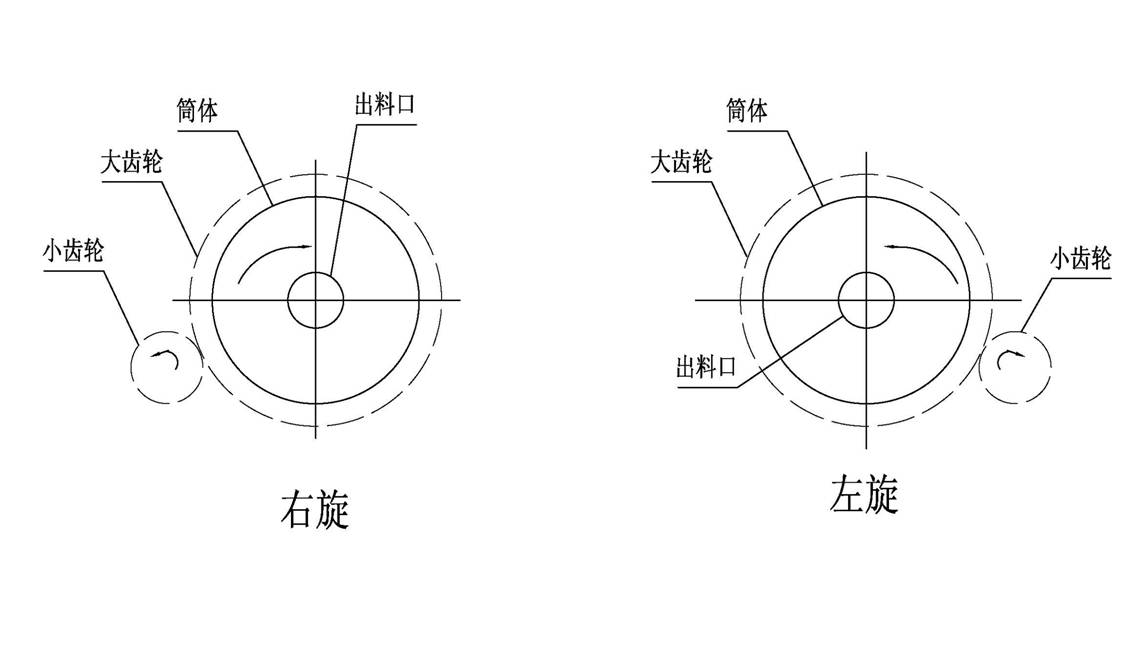 有許多客戶經(jīng)常會問,怎么才能正確的判斷球磨機(jī)運轉(zhuǎn)時是左旋還是右旋,今天河南豫暉礦山機(jī)械有限公司技術(shù)人員以圖為為例為大家解這個因惑:要想判斷球磨機(jī)是左旋還是右旋,要從球磨機(jī)出料口(靠近大齒輪一端)向進(jìn)料口方向看,筒體逆時針旋轉(zhuǎn)為左旋,筒體順時針旋轉(zhuǎn)為右旋;在布置圖上,左旋布置時,傳動部分(過橋)在筒體右側(cè);右旋布置時,傳動部分(過橋)在筒體左側(cè)。如下圖所示: